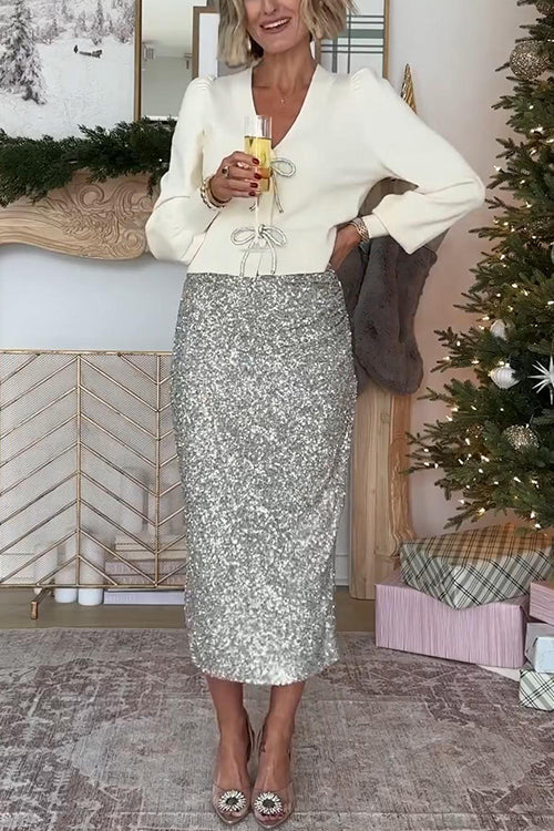 Verleihen Sie Ihrem Look eine süße, zeitlose Note mit diesem Pullover mit V-Ausschnitt und Schleifendetail. Der V-Ausschnitt und die Schleife schaffen eine schmeichelhafte Silhouette und verleihen jedem Ensemble einen Hauch von Weiblichkeit. Sorgfältig gefertigt, hält er Sie die ganze Saison über warm und stilvoll.